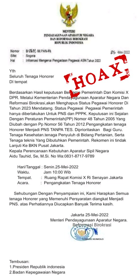 Surat itu beredar berantai melalui pesan singkat WhatsApp. Ternyata, surat tentang Pengangkatan Tenaga Honorer menjadi Pegawai Negeri Sipil (PNS) Tanpa Tes itu adalah surat palsu atau hoaks.