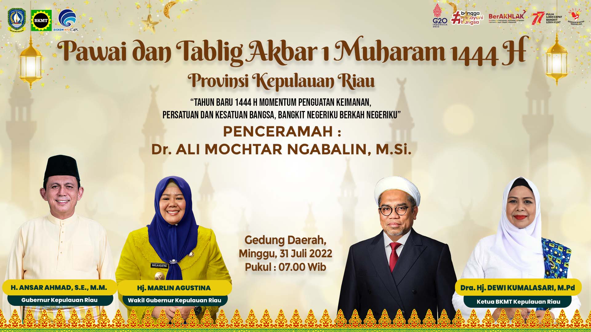 TANJUNGPINANG – Peringatan Tahun Baru Islam atau 1 Muharam 1444 Hijriah yang jatuh pada Minggu (31/7/2022). Pemerintah Provinsi Kepulauan Riau akan memeriahkan 1 Muharam dengan berbagai kegiatan. Mengusung tema “Tahun Baru 1444 H Momentum Penguatan Keimanan, Persatuan, dan Kesatuan Bangsa Bangkit Negeriku Berkah Negeriku”, Pemprov Kepri akan menggelar Pawai Muharam yang diisi dengan penampilan mobil hias, marawis, drum band, marching band. Ada juga menguncang penceramah Dr. Ali Mochtar Ngabalin dari Jakarta yang akan mengisi tabliq Akbar di Gedung Daerah.