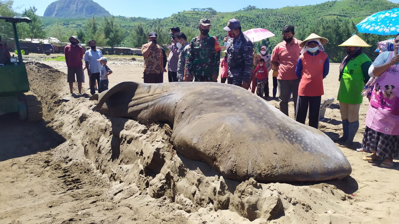 “Masyarakat nelayan bersama Poskamladu TNI AL, Basarta, Pelabuhan Perikanan Pantai Popoh, Polsek Besuki dan Koramil Besuki menarik bangkai hiu paus ke arah pantai untuk proses penanganan lebih lanjut,” terang Yudi.