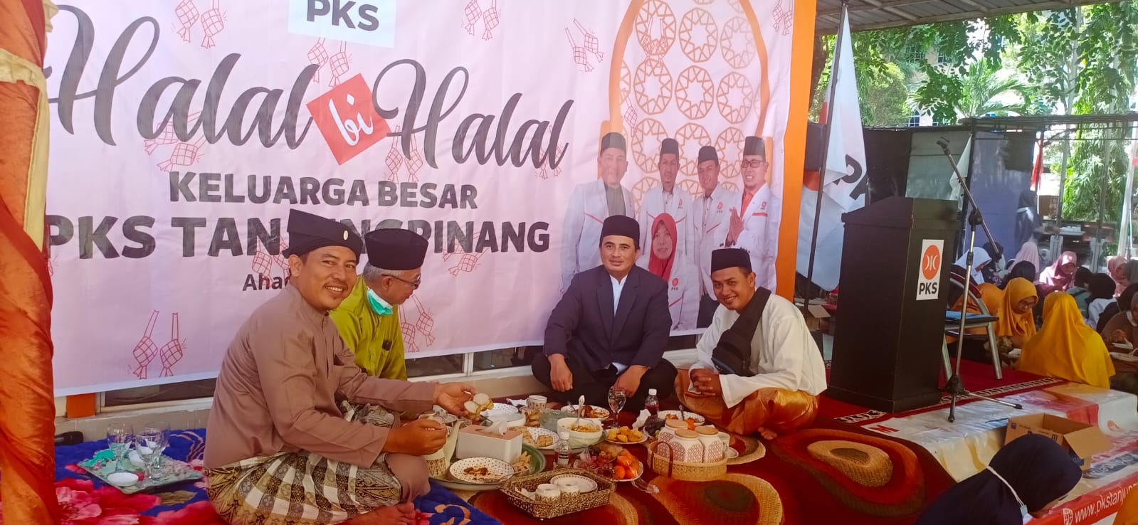 TANJUNGPINANG – DPD PKS Tanjungpinang, Ahad (29/05/2022) menggelar kegiatan halal bi halal (HBH) di pelataran Kantor DPD PKS Tanjungpinang. Ada yang menarik dari halal bi halal tersebut para tamu, kader dan simpatisan di jamu dengan makanan khas Melayu ketupat rendang, sambal serondeng dan makannya beridang khas tata cara makan Melayu, Kepulauan Riau saat melakukan kenduri atau hajatan.