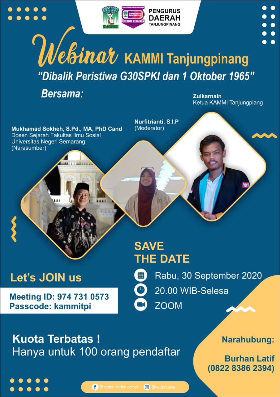 Tanjungpinang – Kesatuan Aksi Mahasiswa Muslim Indonesia (KAMMI) Tanjungpinang melalui Bidang Kajian Publik Melaksanakan Webinar dengan Tema “Dibalik Peristiwa G30S dan 1 Oktober 1965” pada Rabu 30 September 2020.